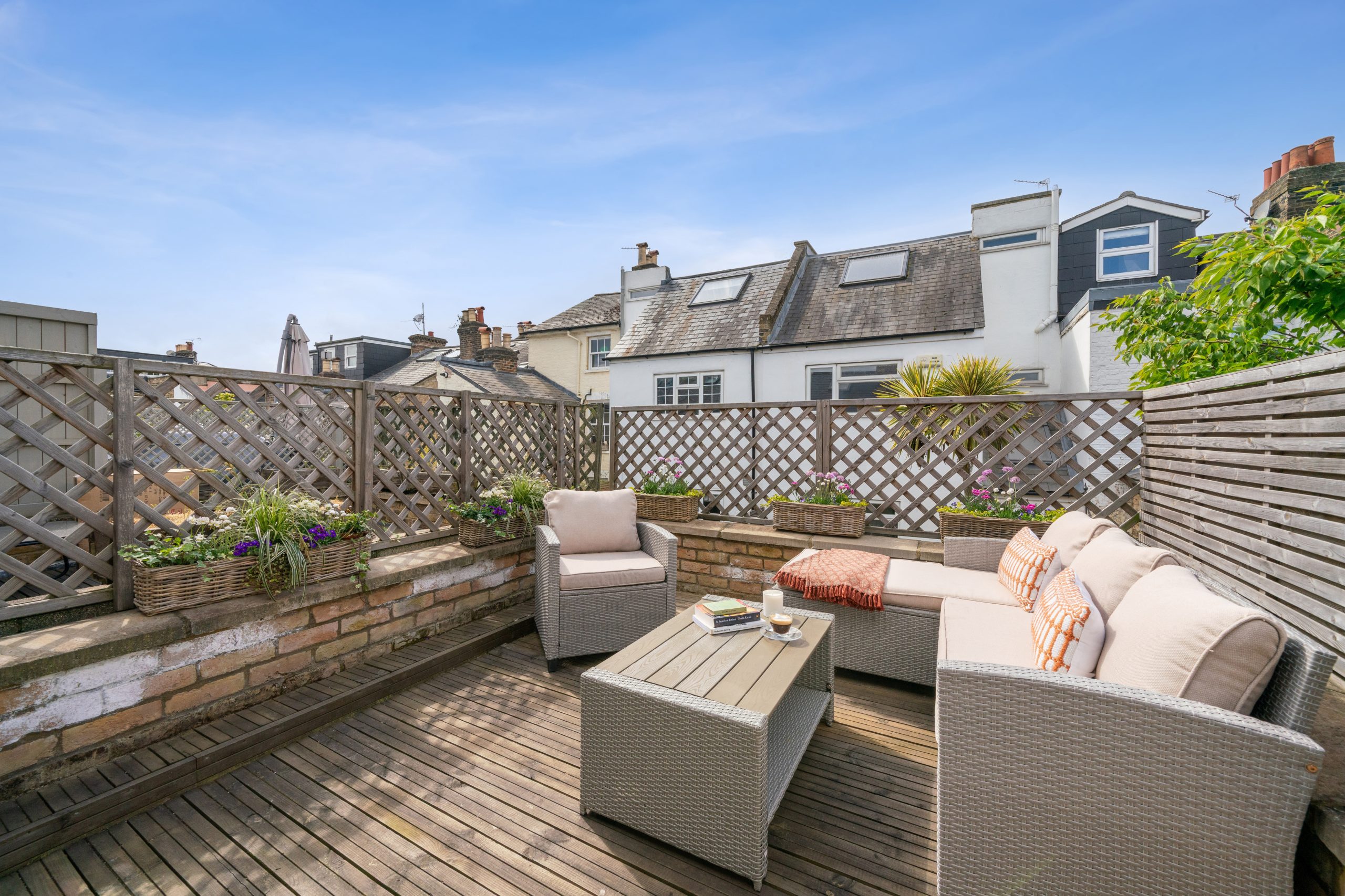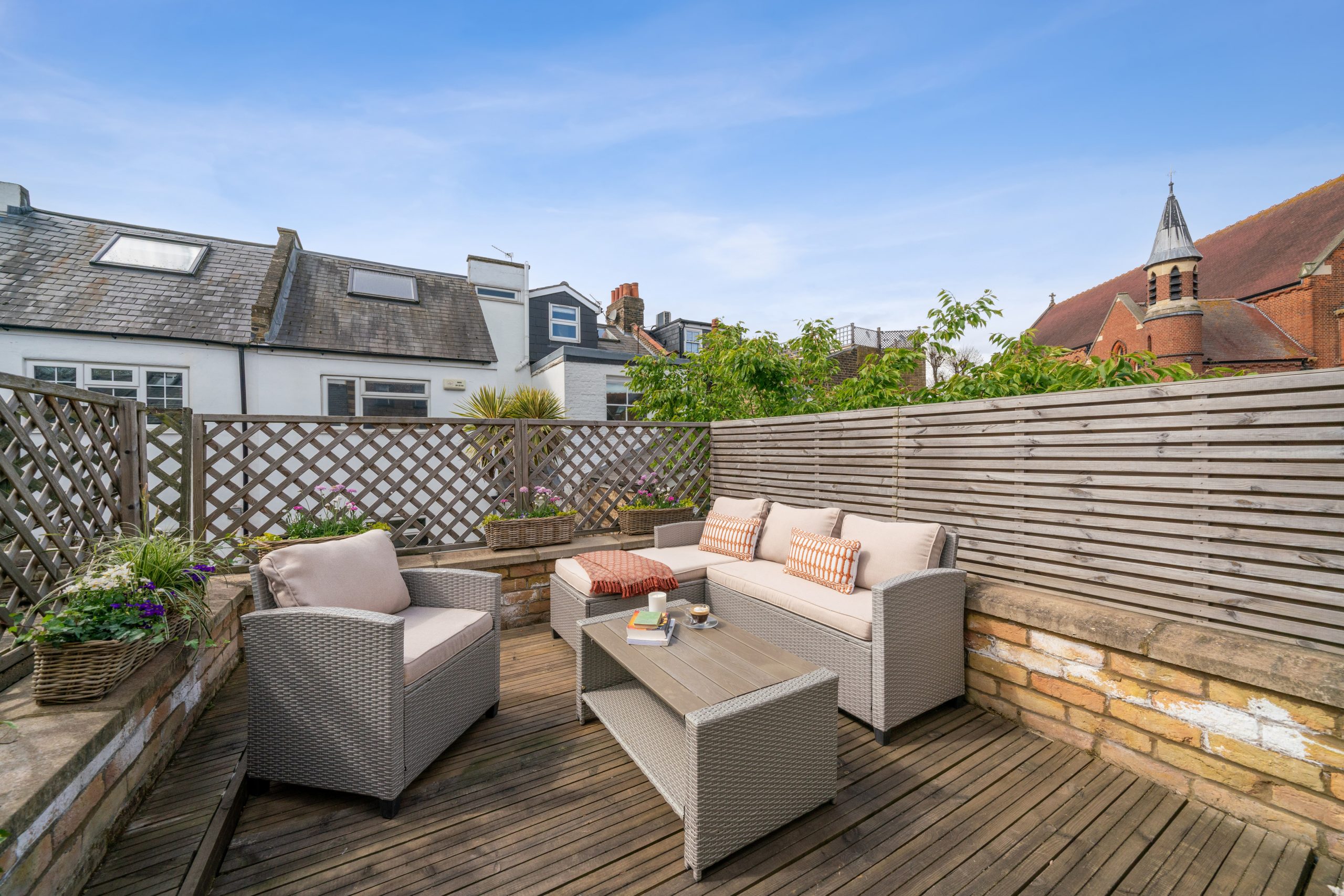 The first floor is home to a spacious principal bedroom complete with built-in wardrobes and a stylish family bathroom. A standout feature of this floor is the access to a superb west-facing roof terrace, offering an ideal sun-drenched spot for evening relaxation.